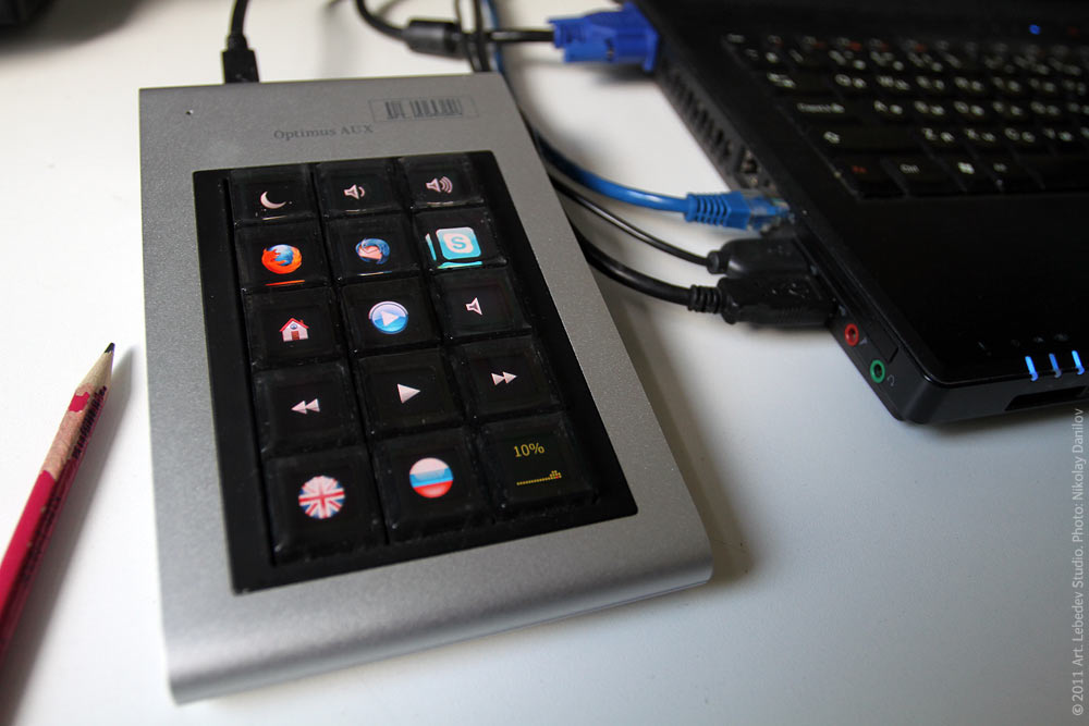 ![]() Optimus Aux is an auxiliary keyboard with 15 screen-buttons. There is only one in existence. Pictured: fully operational preproduction sample. Development of the keyboard took 8 months, mass production was prevented by the crisis of 2008. Optimus Aux will never be produced, a new device will be created to take its place.