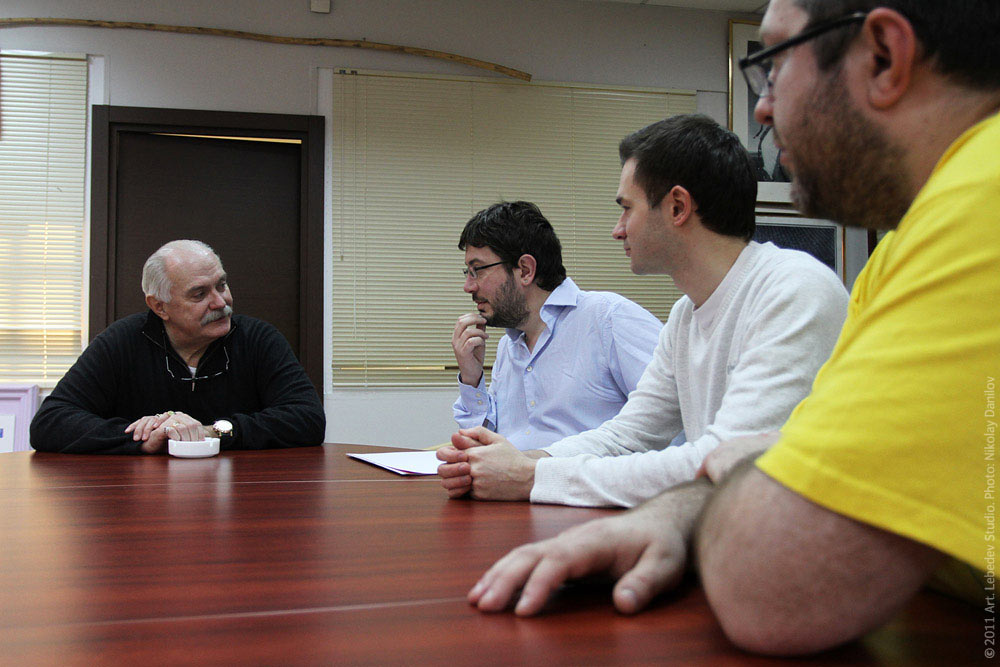 ![]() Nikita Mikhalkov, Artemy Lebedev, head of Art. Lebedev Studio graphic design department Aleksey Luri and the studio's art director Ludwig Bystronovsky discuss variants of the poster for Burnt by the Sun 2: Citadel movie.
