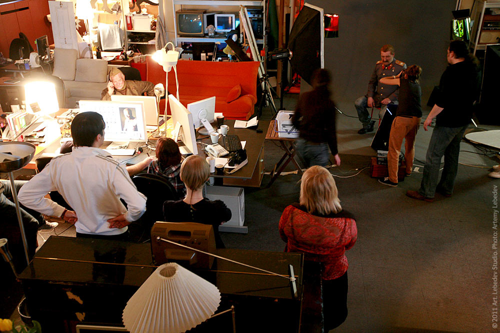 ![]() Ex-general Kotov (Nikita Mikhalkov) and Joseph Stalin (Maxim Sukhanov) at Art. Lebedev Studio preparing for a photo shoot for the poster for the movie Burnt by the Sun 2: Citadel.