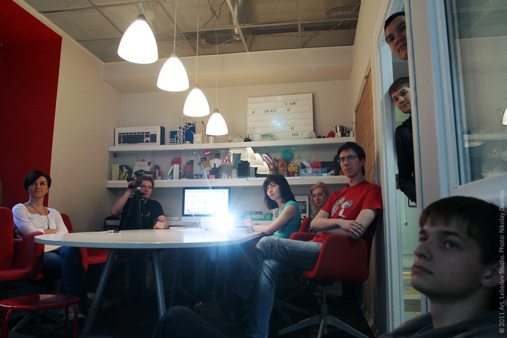 ![]() Employees of the Kiev office of Art. Lebedev Studio came to Moscow to conduct an internal seminar for studio managers and designers. Pictured: manager Irina Kiseleva (third from the left) and technologist Oleg Podchashinsky (fifth from the left) speak about how Delta Bank website was created.