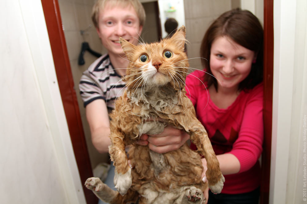 Production manager Alexey Strelnikov and office manager Olga Ivanova bathe Filya the studio cat.