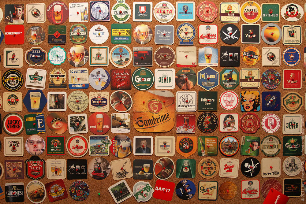 Café on the fifth floor of the studio: a collection of beverage coasters on the wall behind the bar.