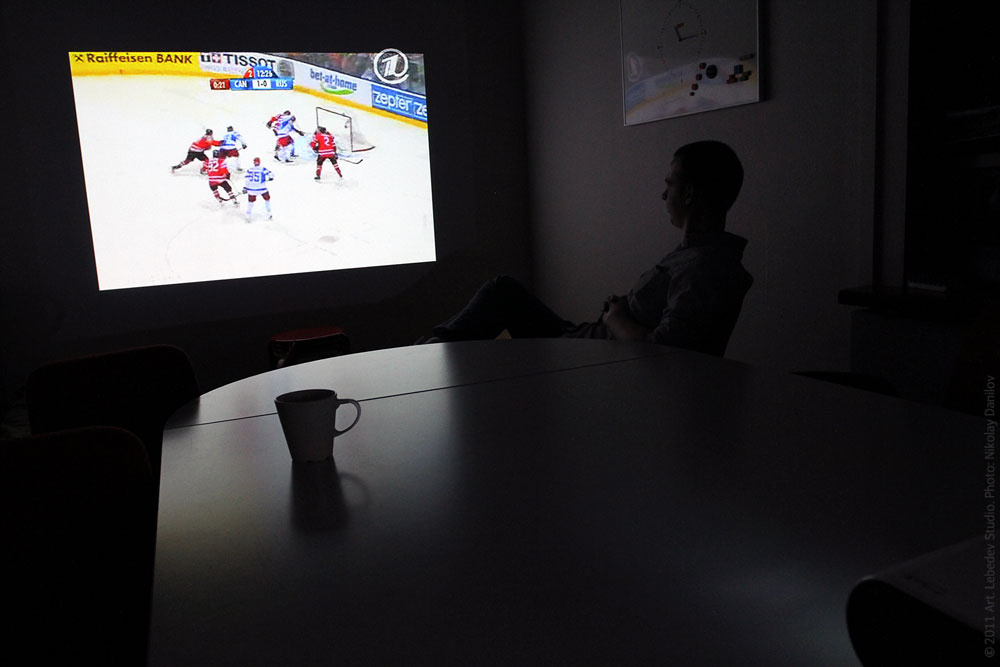 ![]() Meeting room on the first floor of the studio: designer Yegor Zhgun watches Ice Hockey World Championship quarterfinals (Russia vs. Canada).