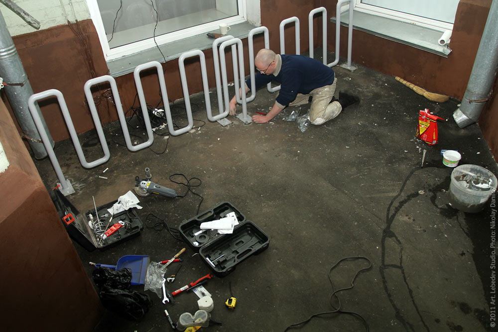 Engineer Andrey Stifeev installs bicycle parking rack in the studio’s yard.