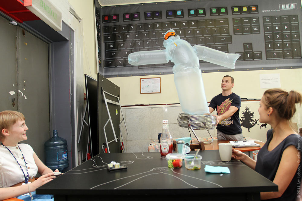 Designer Andrey Fabishevsky trials an inflatable girl made of trash bags and adhesive tape.