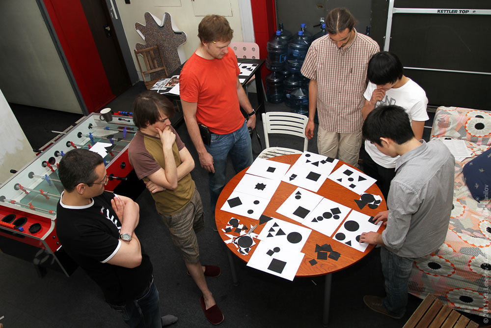 ![]() Studio’s art director Ilya Mikhailov (in orange-red t-shirt) and designer Nikita Nikitin (to the right of Ilya) conduct a workshop on formal composition with studio’s designers.