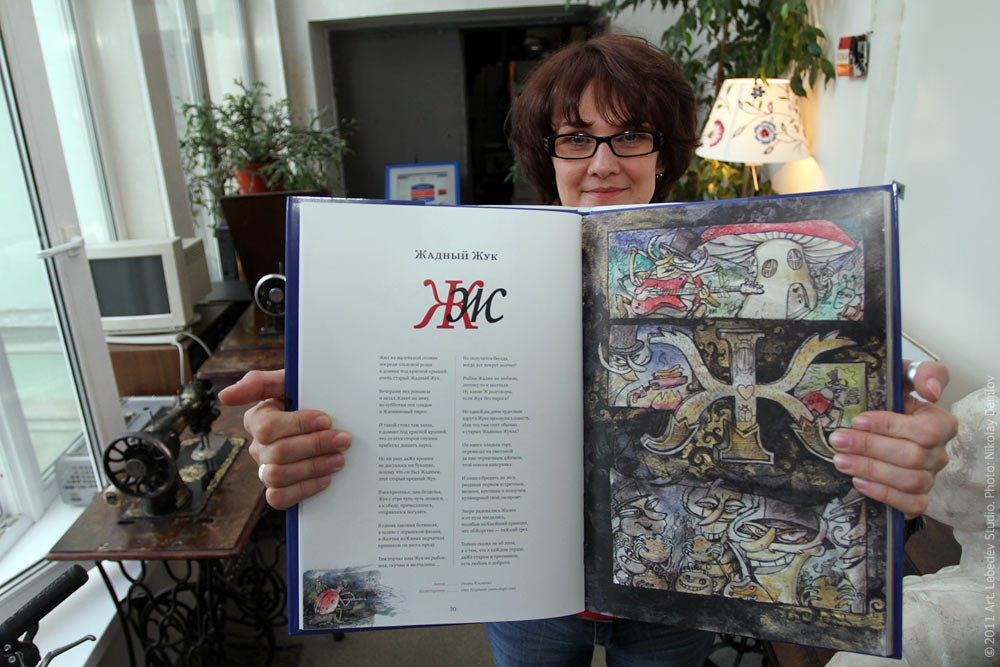 ![]() Head of Web development department Oksana Klimenko demonstrates the book published by the Azbuka project for which she wrote a tale about a greedy beetle and illustrator Oleg Tischenkov drew a picture.