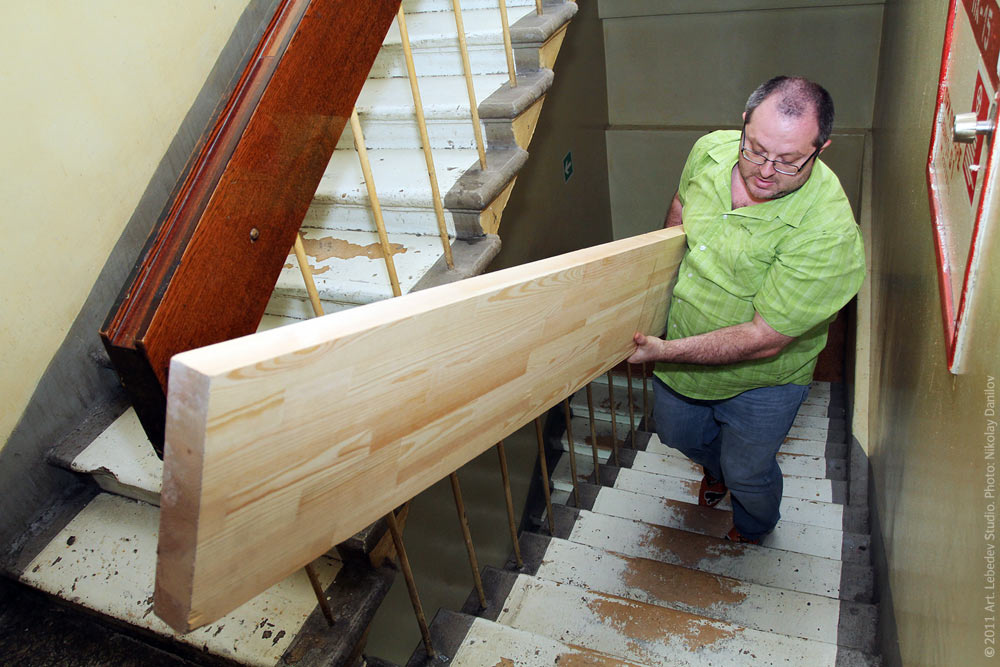 ![]() Art director Ludwig Bystronovsky lifts a four-meter (13 feet) stringer from glued knot-free pine up to the fifth floor of the studio.