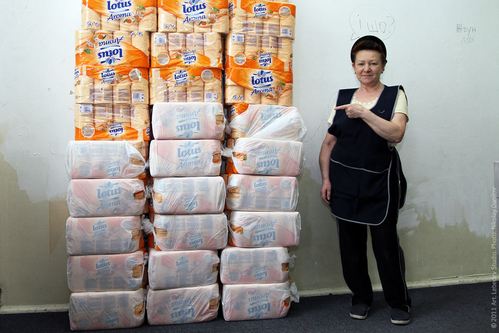 Janitor Lidiya Pryahina demonstrates how much toilet paper Art. Lebedev Studio employees use in one month.