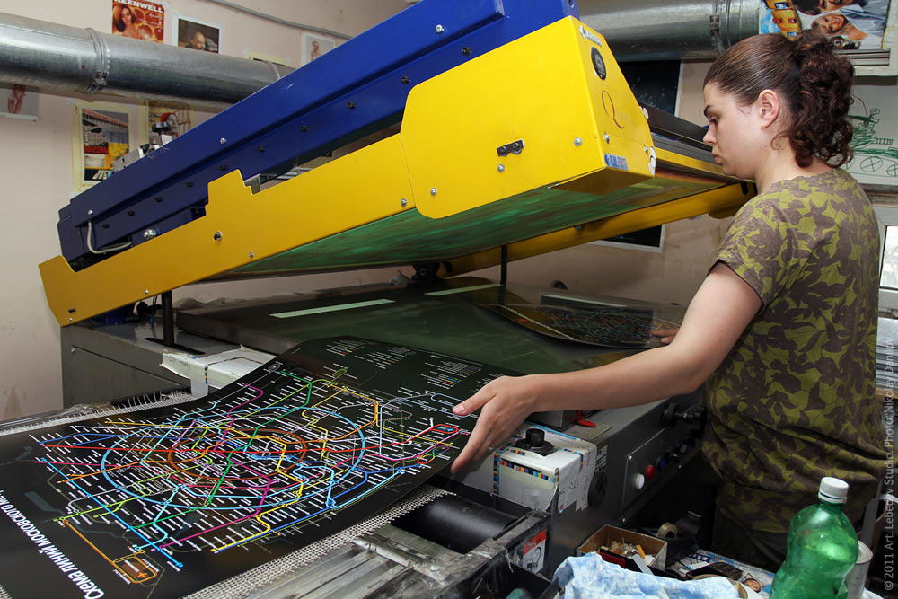 ![]() Assistant printer of UP Print printing house Ninel transfers the Metro-2 line drawn in UV phosphorus powder onto the Moscow Metro in 100 Years map.