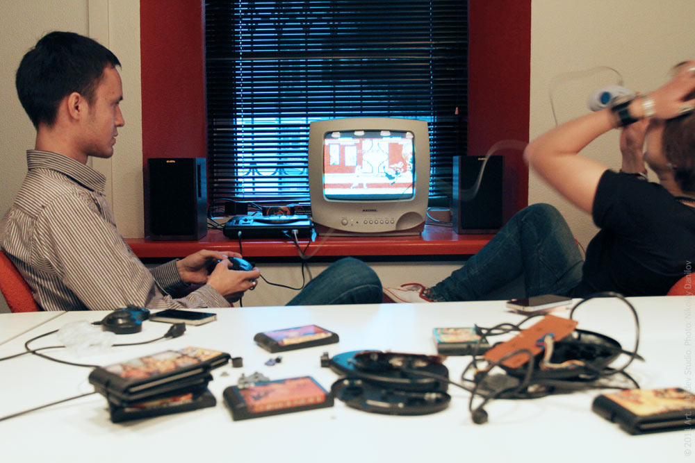 Studio managers Andrey Zhdanov and Natalia Ilyicheva play Mortal Kombat on Sega 16-bit video game console.