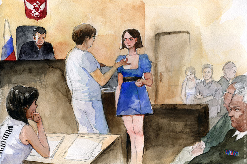 ![]() On June 24 Meshchansky District Court of Moscow held a hearing on the claim of Aeroflot to Artemy Lebedev. Pictured on Maria Menshikova’s courtroom sketch (left to right): Artemy Lebedev’s attorney Lyudmila Maksimenko, judge Aleksey Semchenko, studio’s lawyer Evgeny Potanin, chief specialist of legal support division of Aeroflot's legal department Tatyana Galtseva, journalists and war veterans.