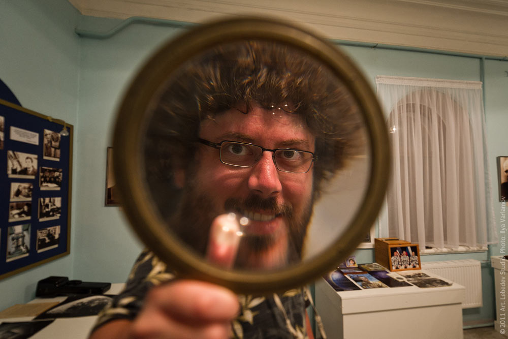 Artemy Lebedev studies the exposition of the museum of Engelgardt Astronomical Observatory in Kazan.