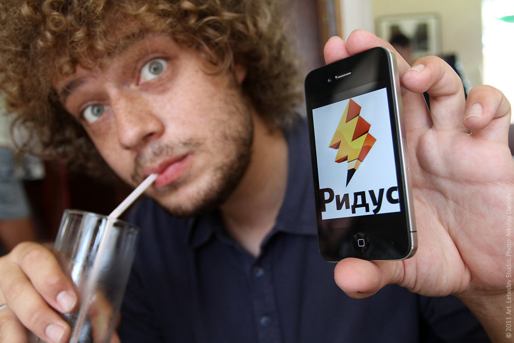 ![]() Founder of the citizen journalism agency Ridus Ilya Varlamov demonstrates the logo created by Art. Lebedev Studio.