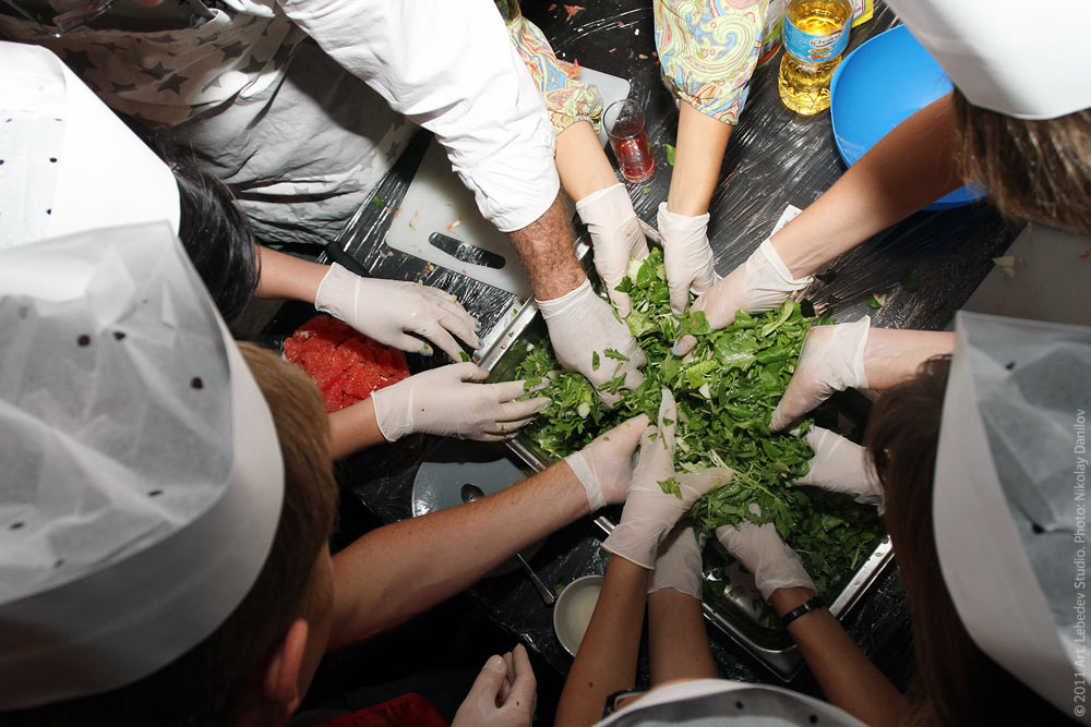 ![]() At night, after the studio’s Big Café closes down, studio employees come down for cooking lessons. Pictured: chef Kakha Eshba guides the preparation of a leaf salad with pumpkin seeds and grilled Suluguni cheese with a dressing of olive oil, lemon, orange and grapefruit juice and balsamic vinegar.