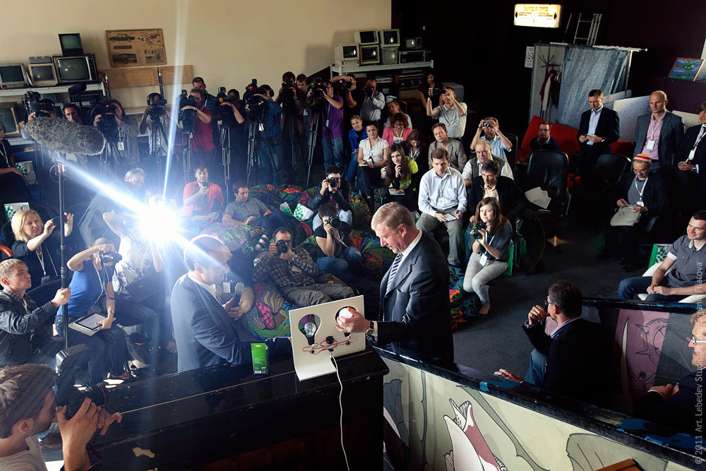 Presentation of the first Russian LED light bulb “Optolux E-27” took place in our studio. The product was developed by “Optogan Group.” “RUSNANO” Chairman of the Executive Board Anatoly Chubais (center, holding the light bulb) and “Optogan Group” Executive VP Alexey Kovsh (with microphone) explain the advantages of LED technology.
