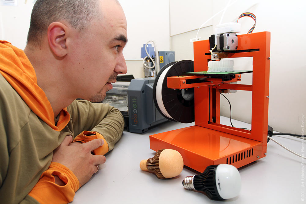Art director Timur Burbayev is watching 3-D printing of life-size model of heat dissipating element for LED lightbulb Optogan. Material used is acrylonitrile butadiene styrene (ABS). Next to the printer you see Optogan life-size model made of modeling foam and cardboard together with a working prototype.