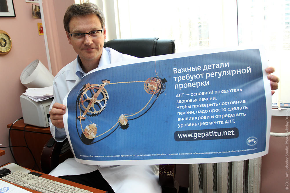 ![]() Pavel Bogomolov, director of Moscow Regional Hepatology Center and chief hepatologist of the Ministry of Health of Moscow Region, with one of the Check Your Liver Health posters.