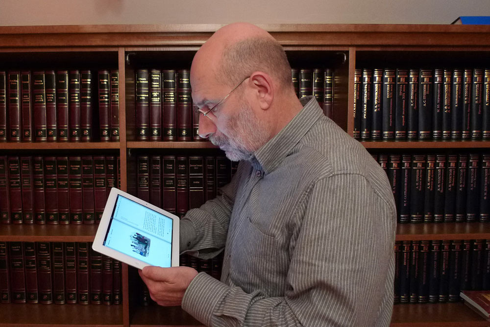 Writer Grigory Chkhartishvili studying Boris Akunin’s e-book—The Diamond Chariot—published by our studio.
