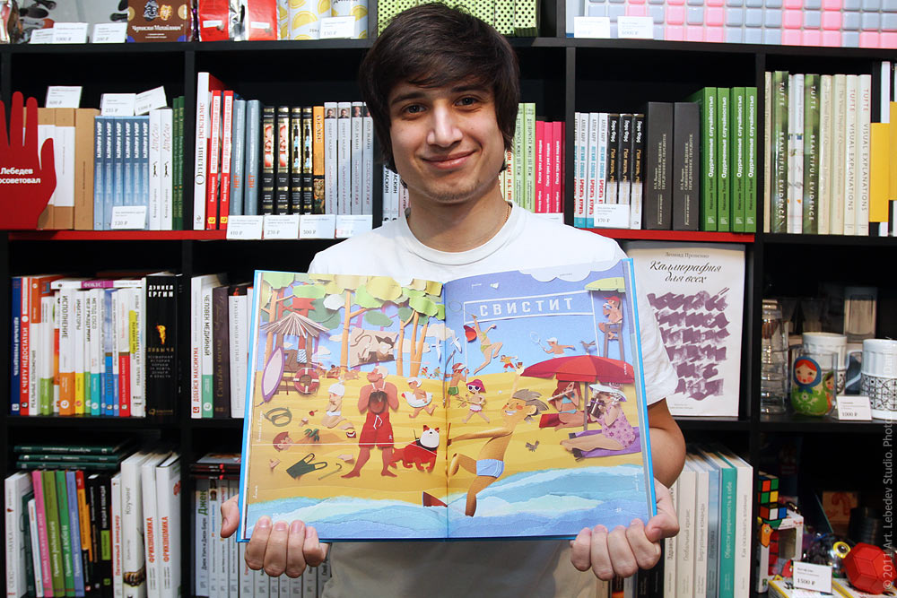 ![]() Sales associate Semyon Karpov demonstrating his favorite pages from Sounds!, the new book by Tatyana Devayeva, Elena Erlikh and Aleksey Lyapunov.