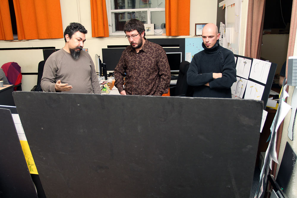 ![]() Architect Nikita Barinov (right) and Artemy Lebedev presenting Komsomolsky Prospekt design concept to Erken Kagarov, Perm Design Development Center director. The avenue is running through Leninsky and Sverdlovsky districts of Perm city.