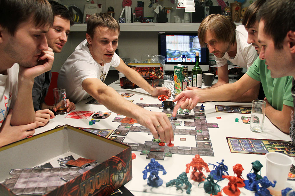 ![]() A round of table Doom. Pictured (left to right): flash-technologist Dmitry Bezverkhy, our former designer Maxim Degtyaryov, designer Oleg Pshenichny, programmer Alexei Kuznetsov, designer Mikhail Miroshnikov, and head of the graphic design department Alexei Luri.