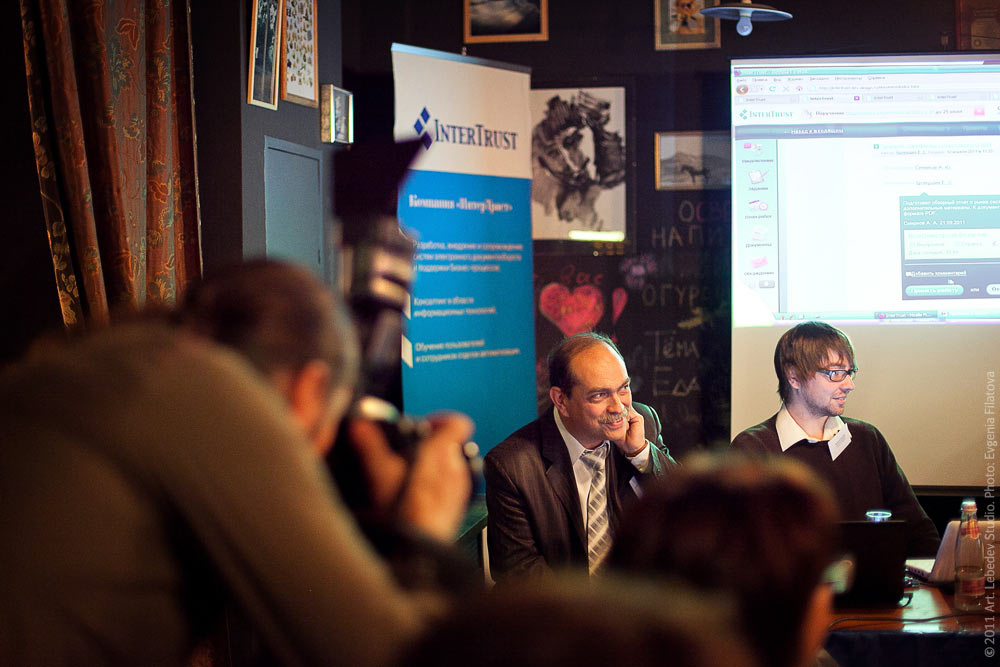 Press Breakfast at our Big Café: Intertrust head of the software development division Aleksander Savelyev (at the table, left) and the studio’s project manager Vladislav Pasechnik presenting paperwork processing interface designed by our studio.