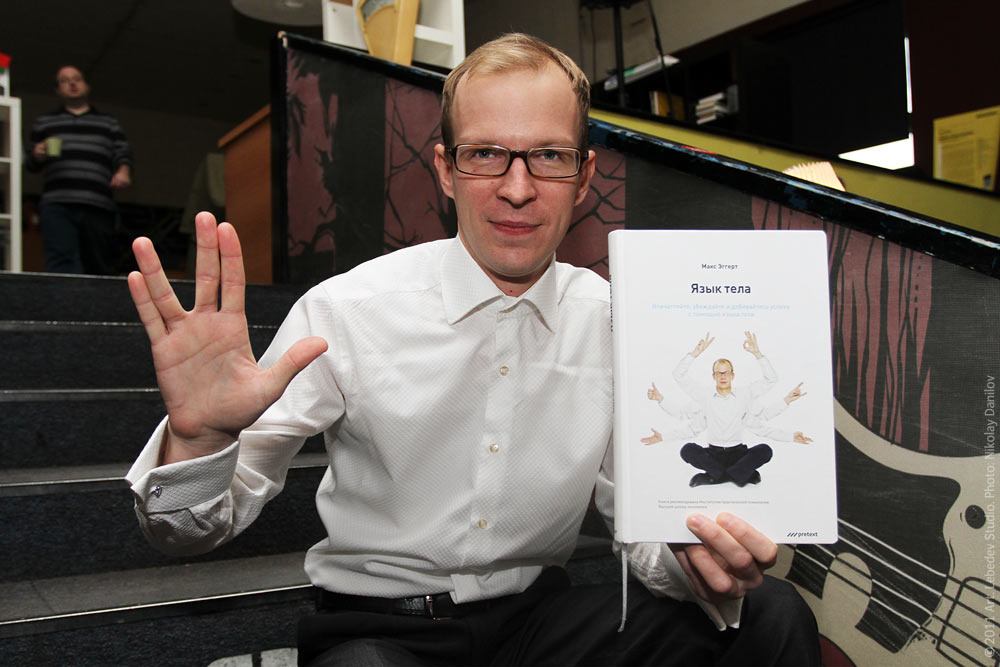 Project manager Maxim Dolgov with Max Eggert’s “Brilliant Body Language” sporting six-armed Maxim Dolgov on the cover.