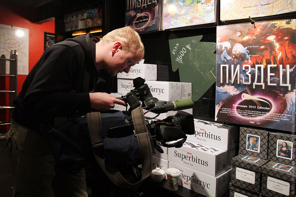 ![]() The studio's store on Bankovsky: crew from Russia Today TV channel working on video featuring our Fuckopalypse calendar.