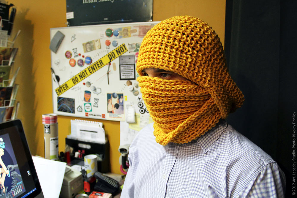 Sales associate Semyon Karpov demonstrating one of the many ways to wear your Sharfus scarf.