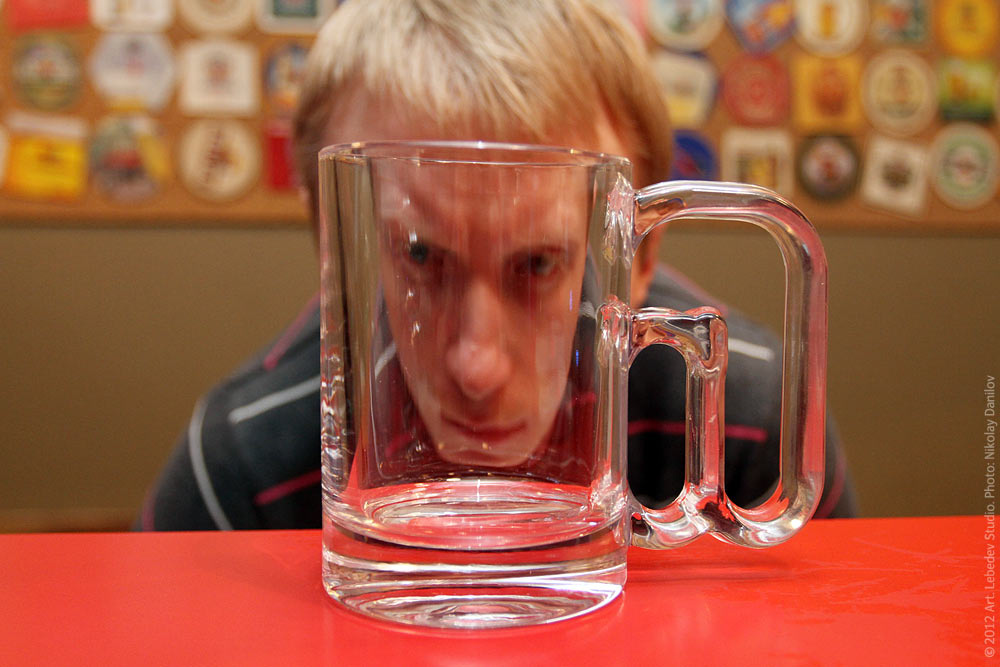 Production manager Alexei Strelnikov studying a pre-production prototype of the new clear Atmark mug.