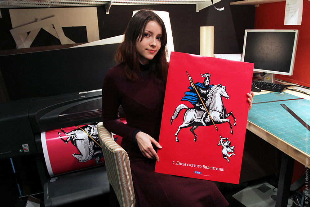Illustrator Maria Menshikova showing Valentine’s Day poster designed in the studio.