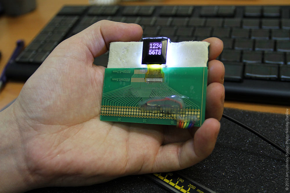 ![]() Originally we planned to use black and white displays in Optimus Maximus keys. Pictured: studio senior engineer Maxim Pavlukhin showing demo circuit board with black and white LCD with 32 by 32 pixels resolution. Later on, we’ve changed out mind and Optimus Maximus went into production with full-color OLED displays with 48 by 48 resolution; black and white version went directly to archives.