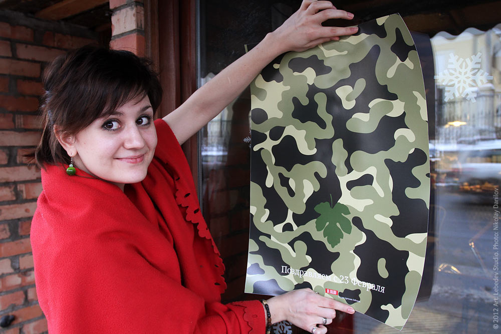![]() Hostess Evgenia Onokhova decorating the studio’s café on Bolshaya Nikitskaya with a poster we designed to commemorate Defender of the Motherland Day.