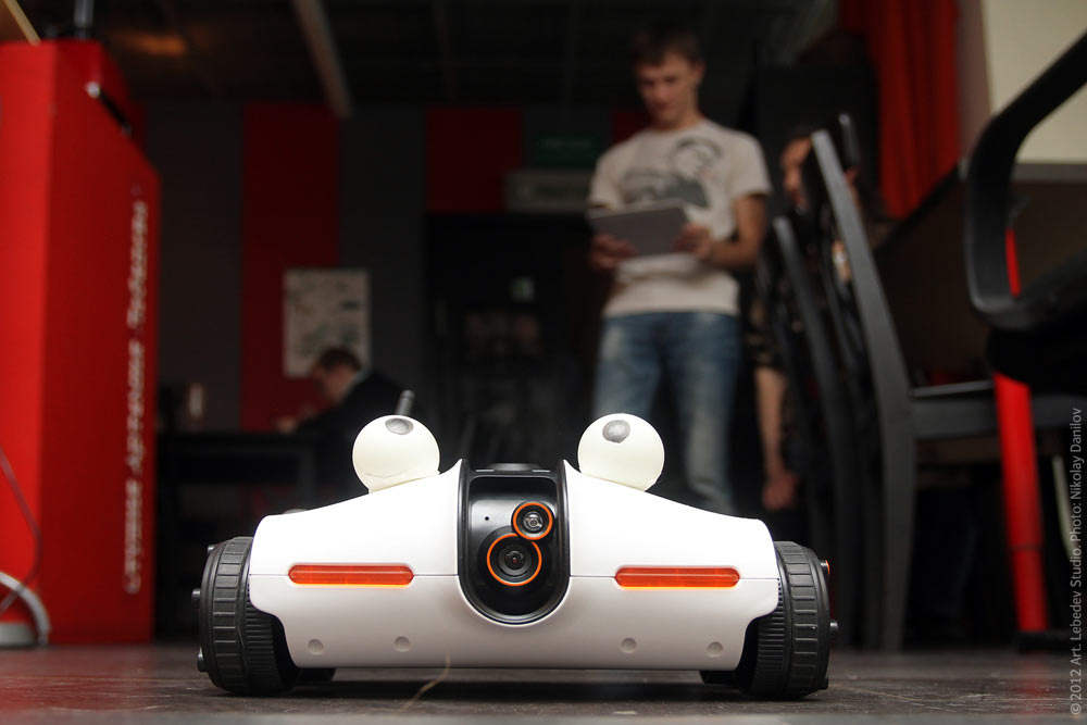 Remotely controlled from an iPad, robot is getting itself acquainted with the studio.
