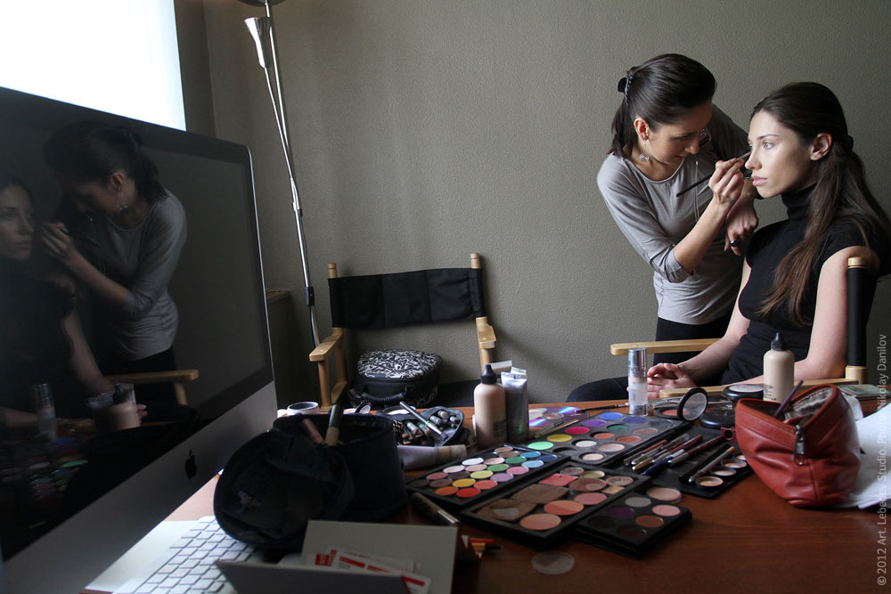 Makeup artist Svetlana Nakolyushkina preparing model Viktoria Balandina for Gosloto photo shoot.