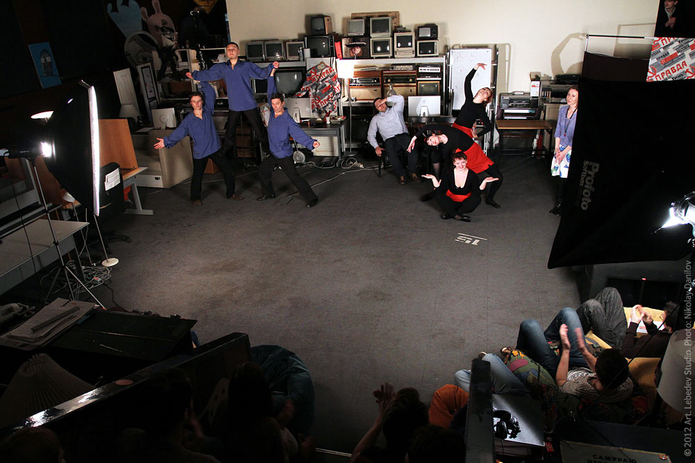 ![]() Our Moscow headquarters, fifth floor: actors from Komediant performing “Mashina Chudakova” (Mr. Weird’s Machine), a play based on Vladimir Mayakovsky’s “Bania” (Sauna). |