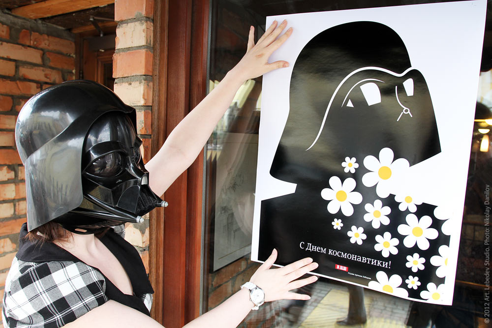 ![]() Administrator Olga Ivanova dressing up our сafé on Bolshaya Nikitskaya with a poster for the upcoming Space Exploration Day, celebrated in Russia on April 12.