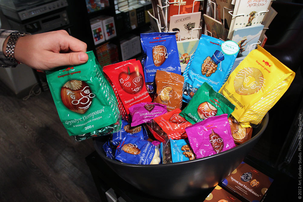 ![]() The studio’s stores now carry a wider range of Ozersky Souvenir chocolates: besides regular Kuraga Petrovna (dried apricots) and Chernosliv Mikhailovich (prunes), we now offer Mindal Ivanovich (almonds), Klubnika Nikolayevna (strawberries), Vishnya Vladimirovna (cherries), Izyum Vasilyevich (raisins), Ananas Denisovich (pineapple), Funduk Petrovich (hazelnut), and Orekh Sergeyevich Gretsky (walnut).