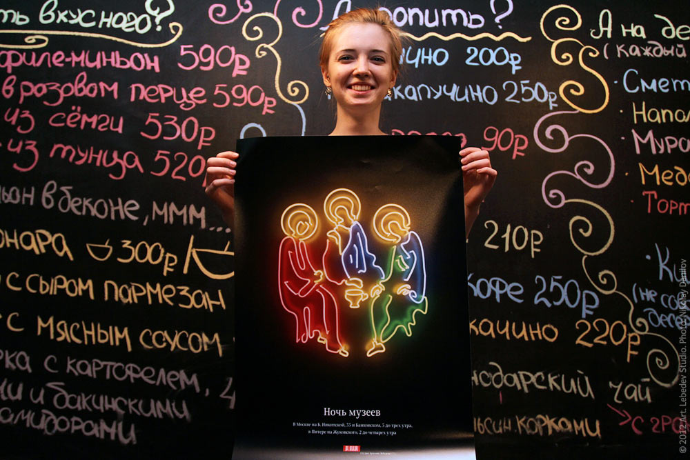 ![]() Our Big Café on Bankovsky: hostess Valeria Suslova with our Night at the Museum poster announcing new hours for the night of May 19-20—our Moscow cafés are open till 3 a.m. and St. Petersburg café till 4 a.m.