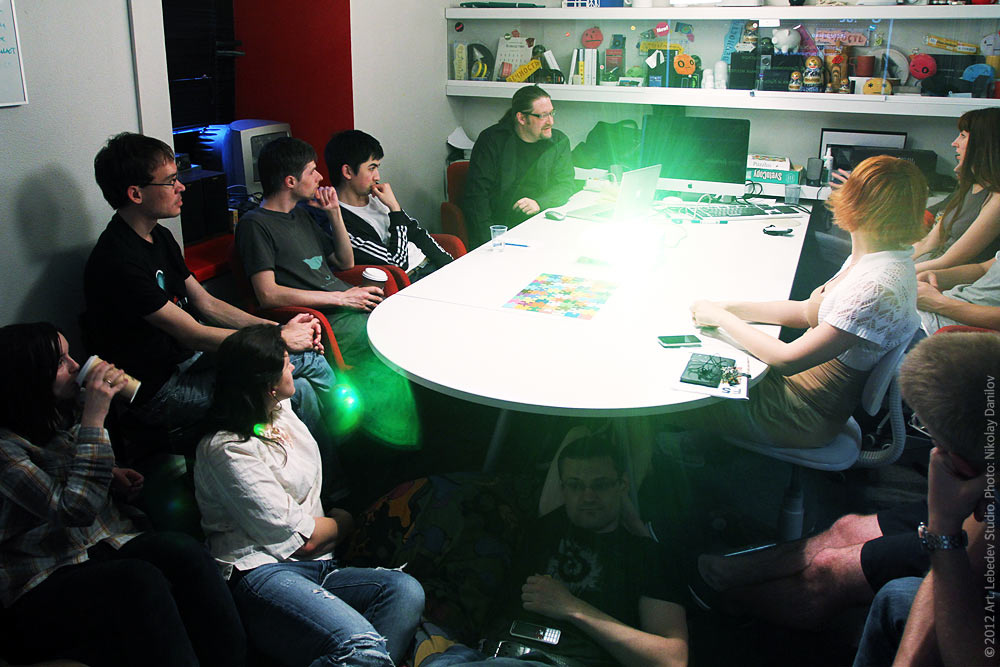 The latest presentation at the studio: Maksim Nesterenko (center, next to a laptop)—a professor from the British Higher School of Art and Design—shed some light on design history.