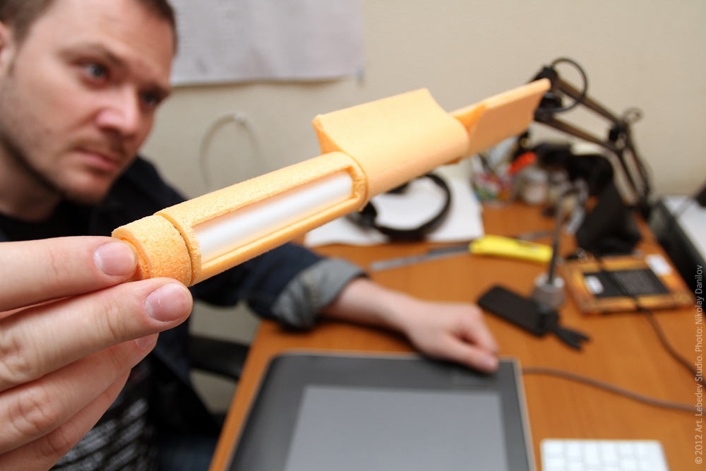 Designer Alexei Sharshakov with a Lampus task lamp life-size model.