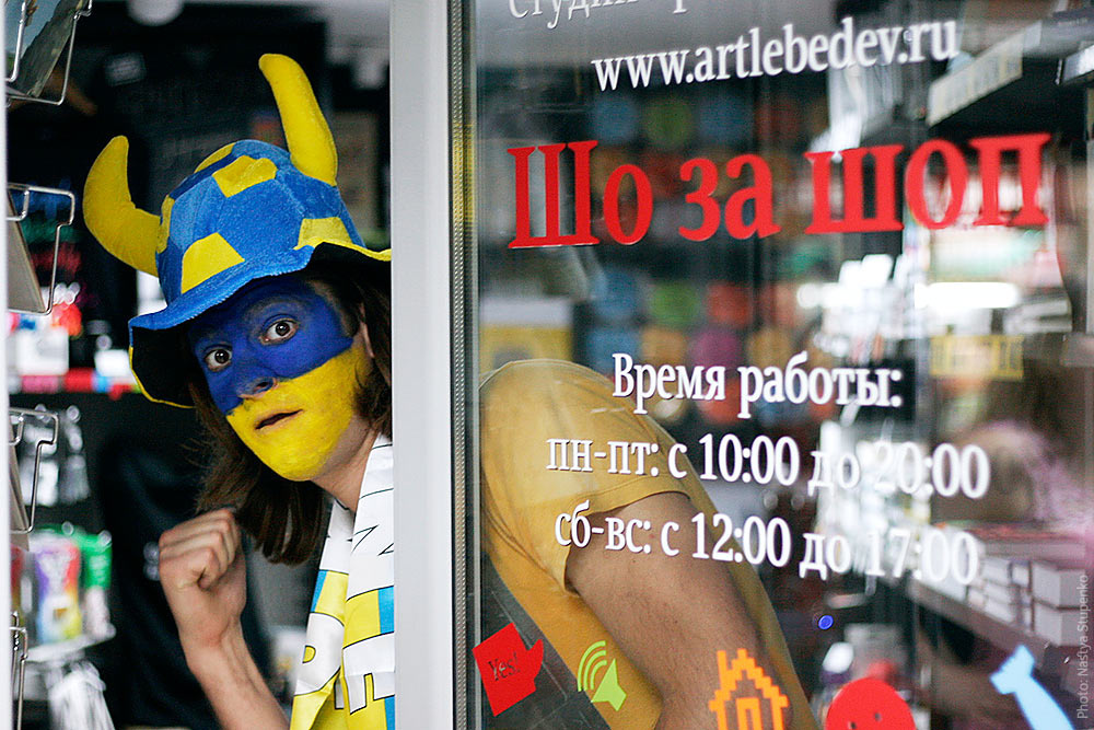 ![]() Euro 2012: Aleksandr Gorobets, sales associate from our Kiev store Sho Za Shop, supporting his team right from his workplace.
