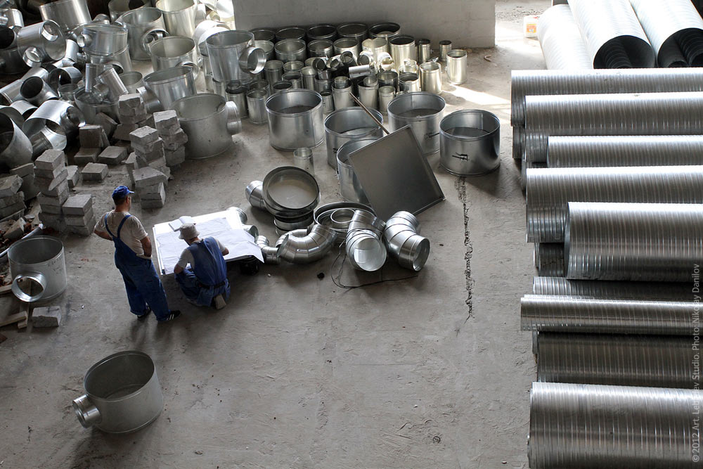 Workers are beginning the installation of ductwork in the studio’s new office.