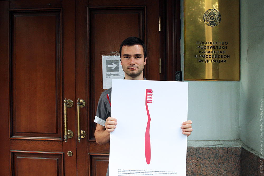 ![]() Aleksey Luri, head of graphic design department, picketing the embassy of the Republic of Kazakhstan in Moscow with a poster dedicated to a coming meeting of the studio’s potential customers and Aleksey Luri in Kazakhstan.