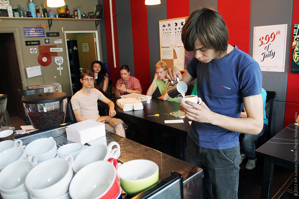 ![]() Cup Tasting 2010 champion, coffee roasting 2011 Russia champion, and barista-coach Dmitry Boroday teaching a coffee-making class at the studio.