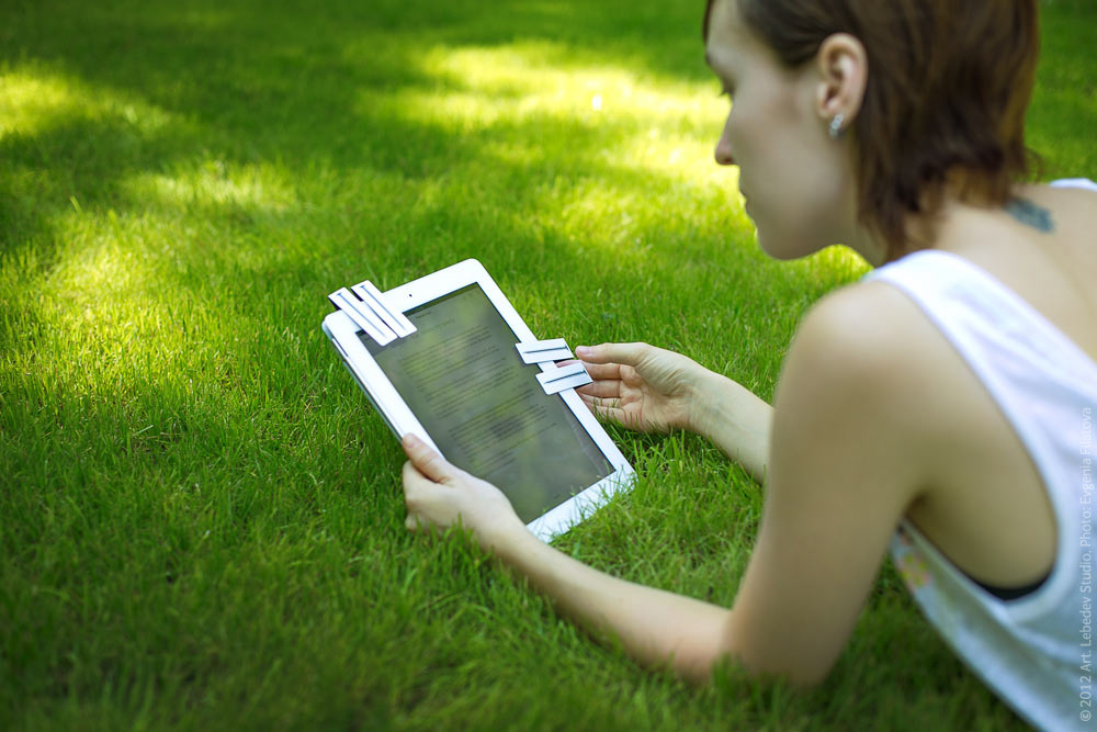 Designer Olga Le trying new Zakladkuses on an e-reader.