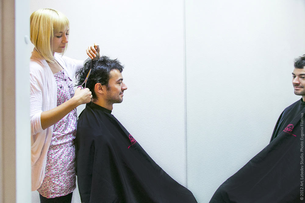 Project manager Irina Ostasheva giving a haircut to designer Iskander Mukhamadeyev.