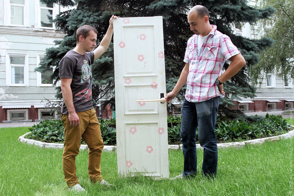 Designer Andrey Fabishevsky and art director Timur Burbayev examining Leverus door handle life-size mock-up.