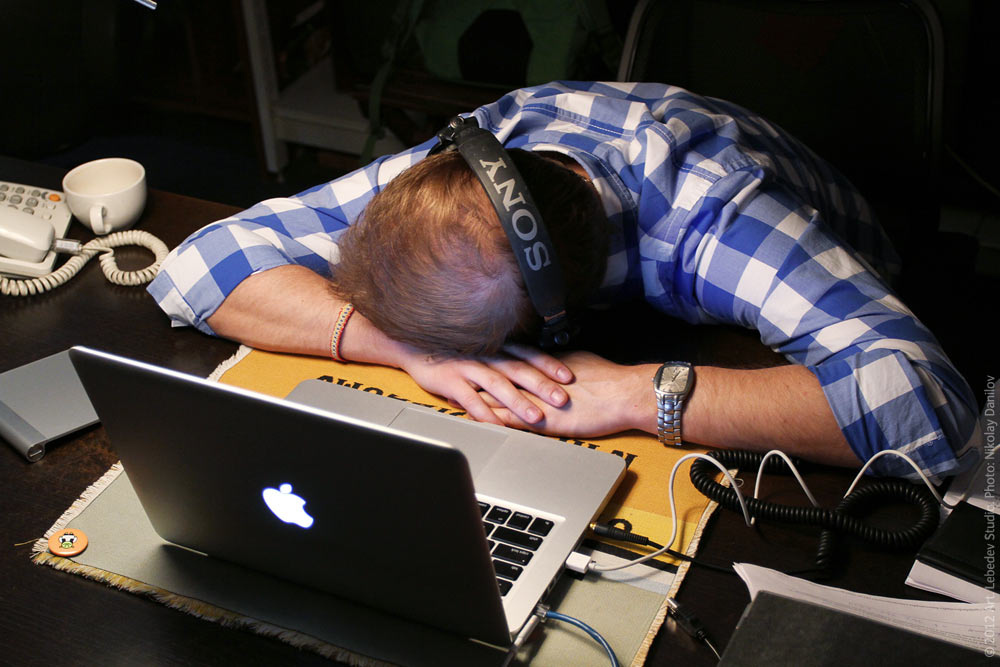 Project manager Vsevolod Ivanov snoozing at his desk.